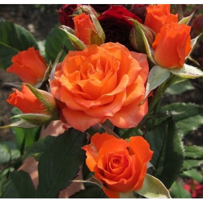 Бутон оранжевого оттенка имеет форму изящного бокала, размер цветков достигает 5 см. Распустившиеся соцветие держится до 14 дней. Небольшие бутончики собраны в зонтиковидные соцветия, образующие пышные «шапки» в центре розового куста. Растение цветет весь сезон, отлично зимует в открытом грунте и не требует особого ухода, отличается хорошей устойчивостью к заболеваниям.